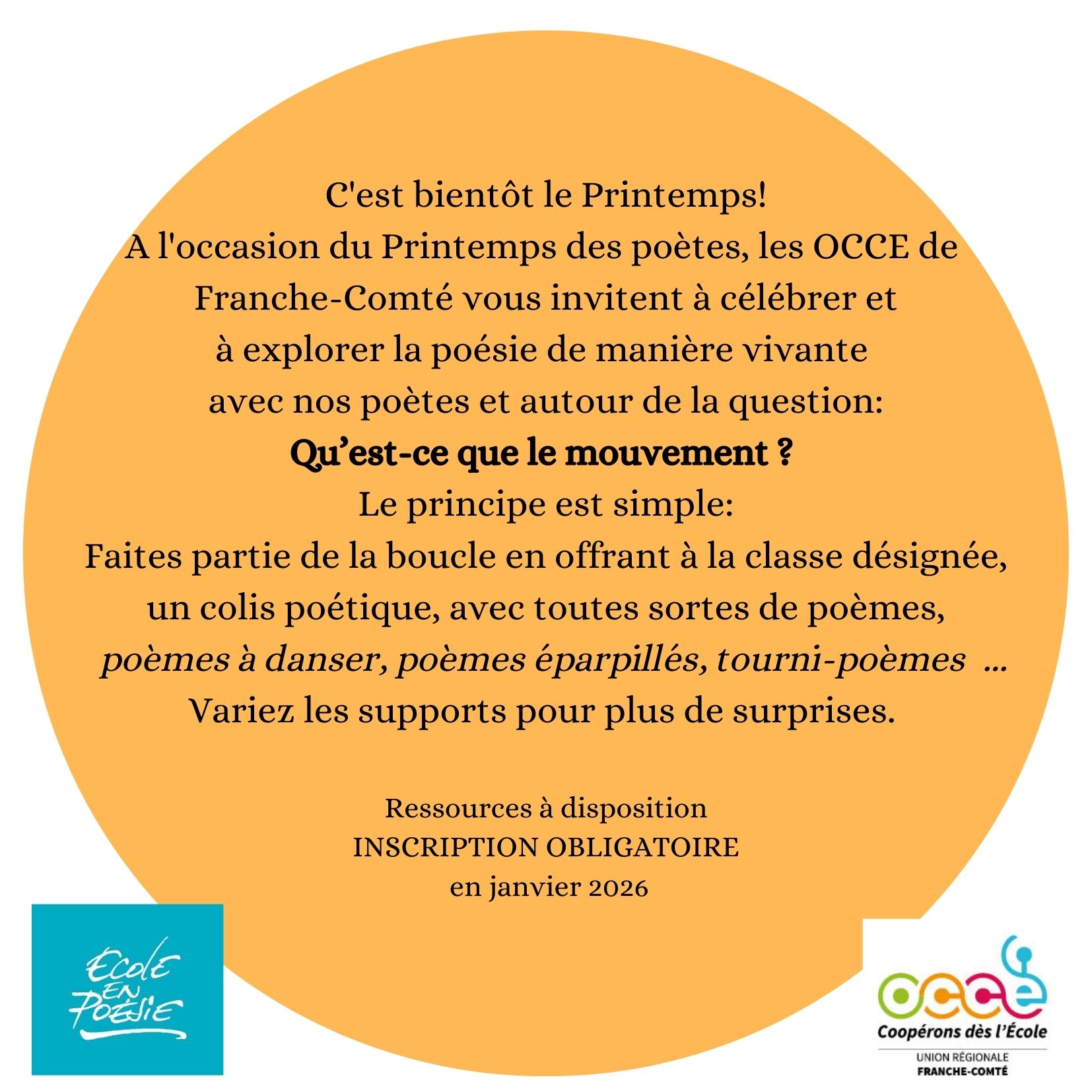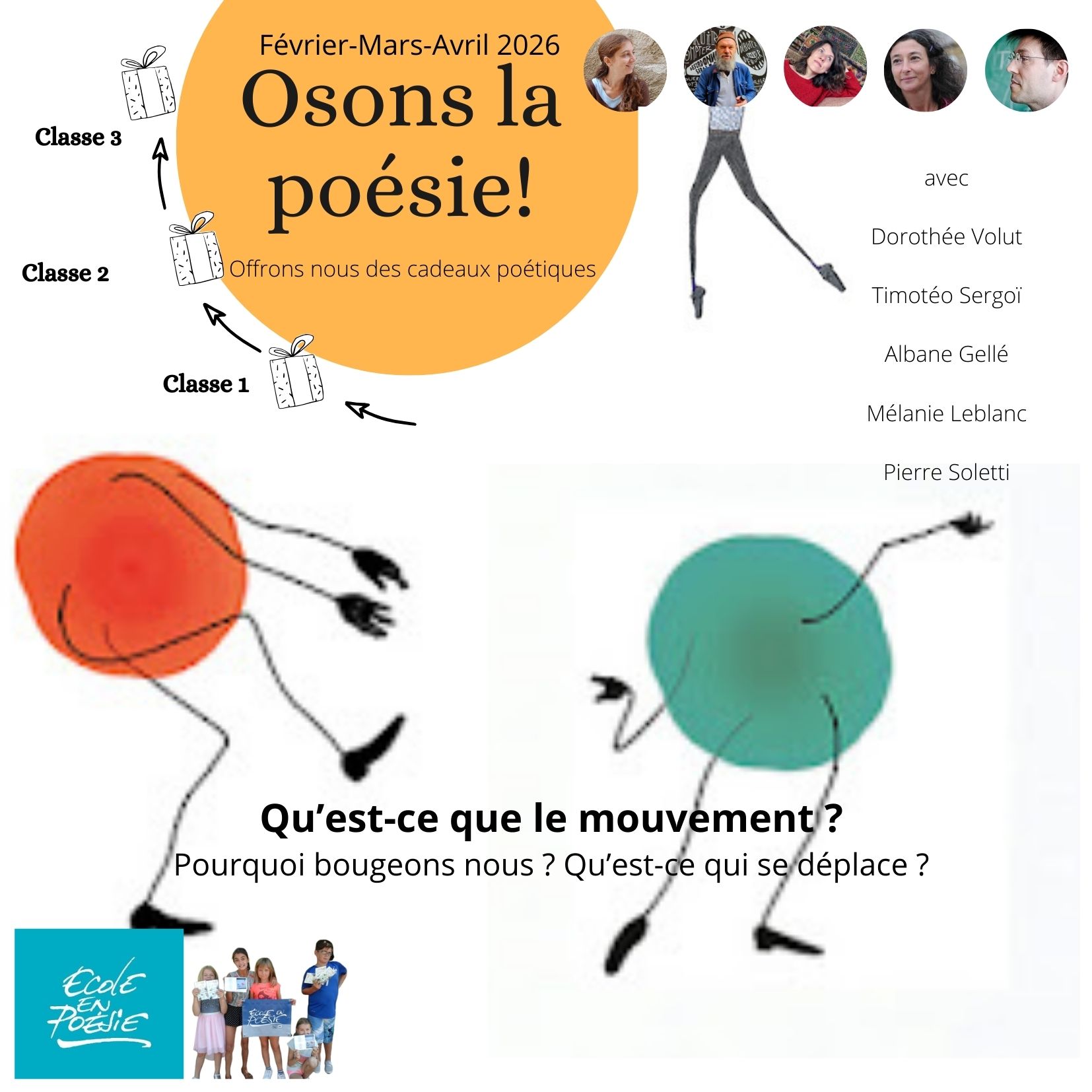 En 2026, nous vous invitons à célébrer et à explorer la poésie avec 5 auteurs : Dorothée Volut, Timotéo Sergoï, Alban Gellé, Mélanie Leblanc, Pierre Soletti, auteurs OCCE.